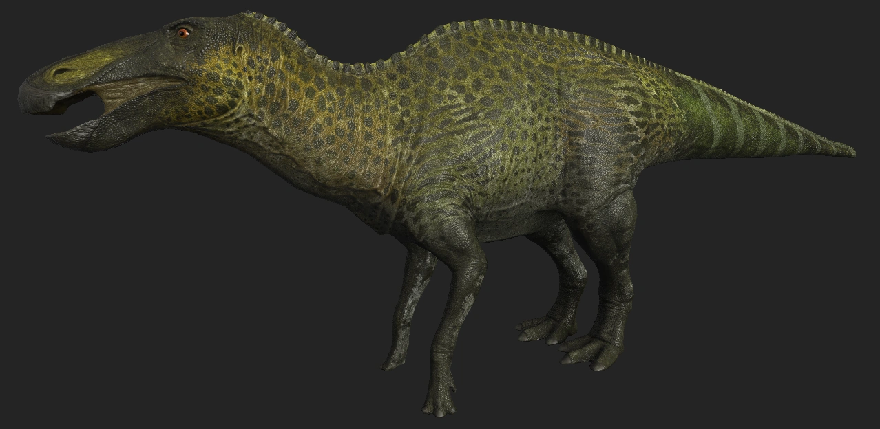 "Anatosaurus" is one of the most common dinosaurus in Hell Creek, and will likely be a major food source for Tyrannosaurus. It is green with darker spots and rings on the tail. Males have multicolored stripes on the head and neck, presumably for display.