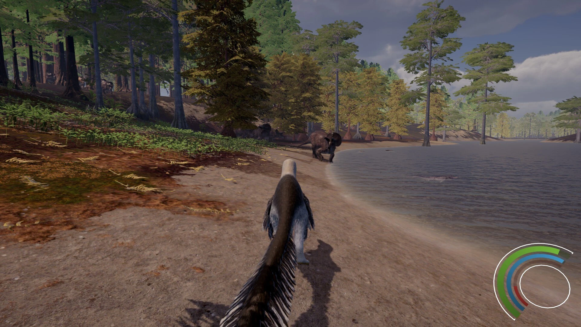 Dakotaraptor walking in the shore, as a Brachychampsa swims away, with female Triceratops and a Champsosaurus in the background