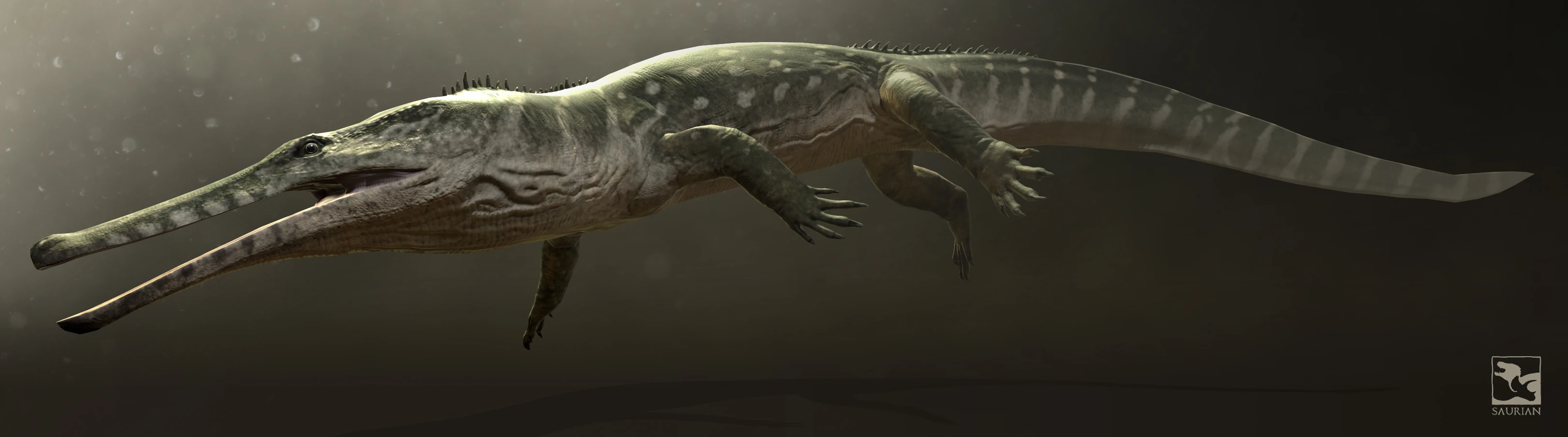 "Champsosaurus (Crocodile Saurian) is extremely similar to crocodilians in body form and behaviour. However, this animal is not a crocodilian, but a member of a far more ancient brand of reptile that has left no living relatives. Though less common in the study area than the crocodilians proper, Champsosaurus are still ubiquitous throughout the waterways, snatching fish with their long, thin snouts. Although their group is now entirely gone, this animal did survive the great extinction and right through into the Eocene, some 64 mya."