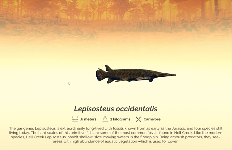 It is currently in Saurian. It is a common sight in the freshwater environments of Hell Creek. Currently, there is no sexual dimorphism or ontogenic stages for Lepisosteus.