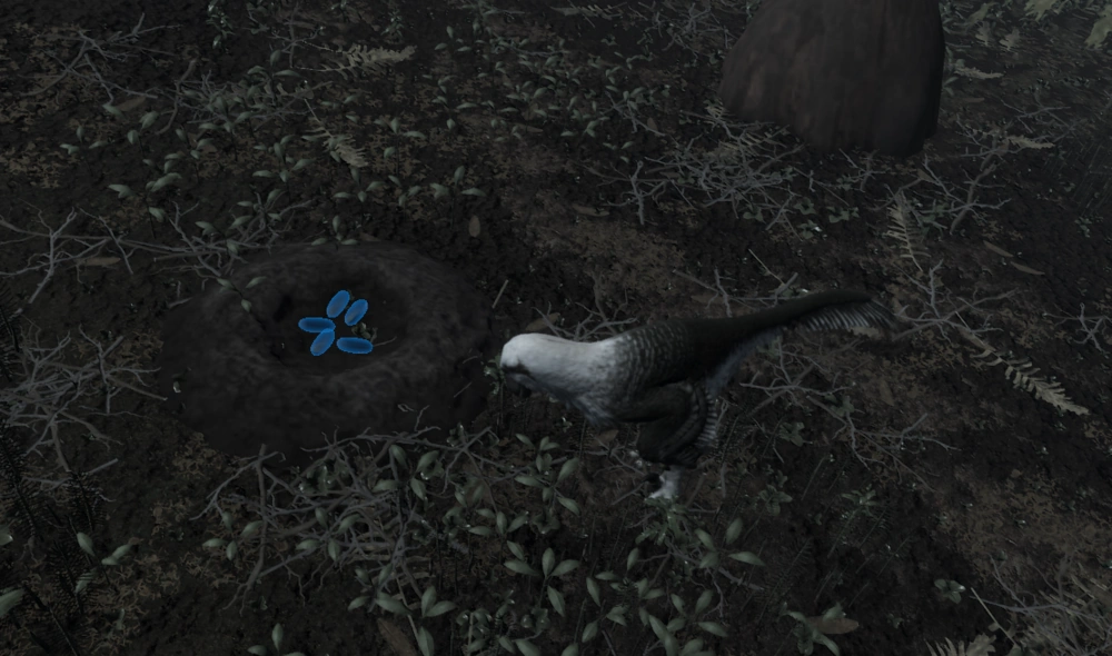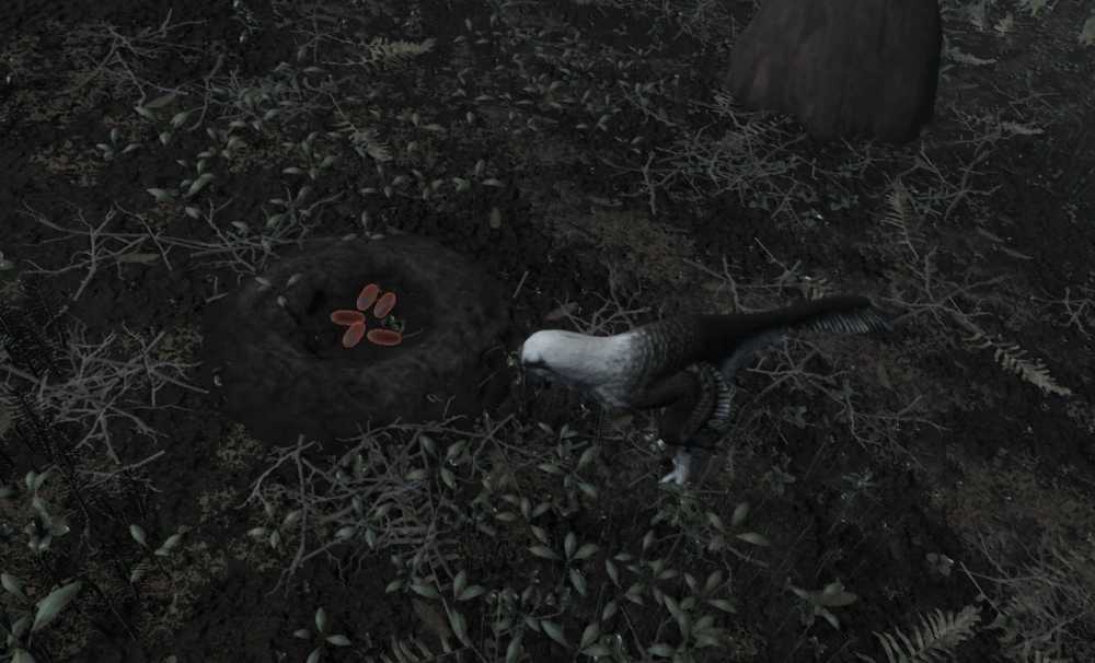 The Dakotaraptor nest is simple to construct. Once the nest is placed down, the player will have to press LMB over the nest a few times to build dirt on the nest, and once completed, a pair of cutscenes will play, with the latter being consisted by the player sitting over its nest with eggs. Dakotaraptor eggs are elongated and blue, in color. To keep the eggs warm, the player must brood them by sitting over them, transfering body heat to them.